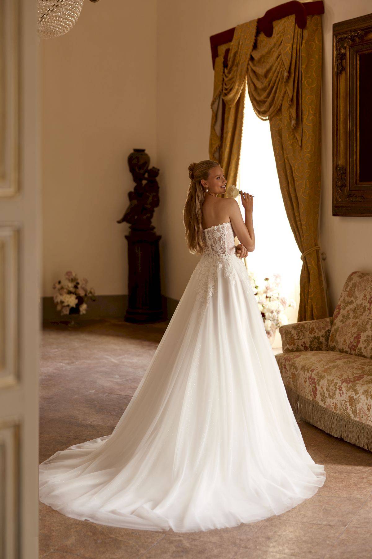 Laissez-vous séduire par la robe de mariée Alcetta, une création trapèze qui mélange à la perfection romantisme classique et détails étincelants. Cette pièce est faite pour les mariées qui cherchent un look aérien à la fois doux et affirmé.