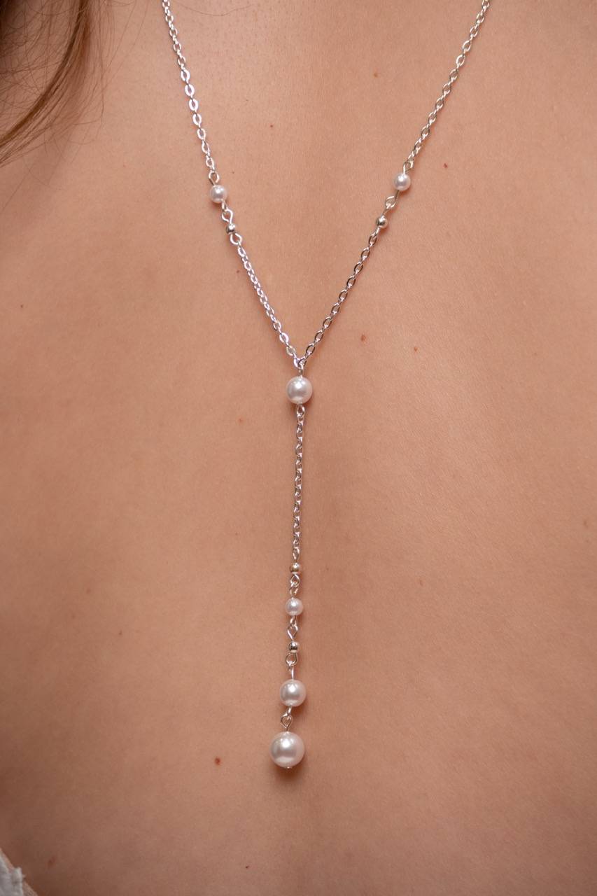 Cette parure se distingue par l'élégant jeu de ses chaînes fines et multiples qui se drapent délicatement dans le dos, créant un effet "cascade" très chic. Le design est rehaussé de perles discrètes, ajoutant une note de romantisme intemporel. Les perles, souvent synonymes de pureté, se marient à merveille avec la modernité des chaînes.