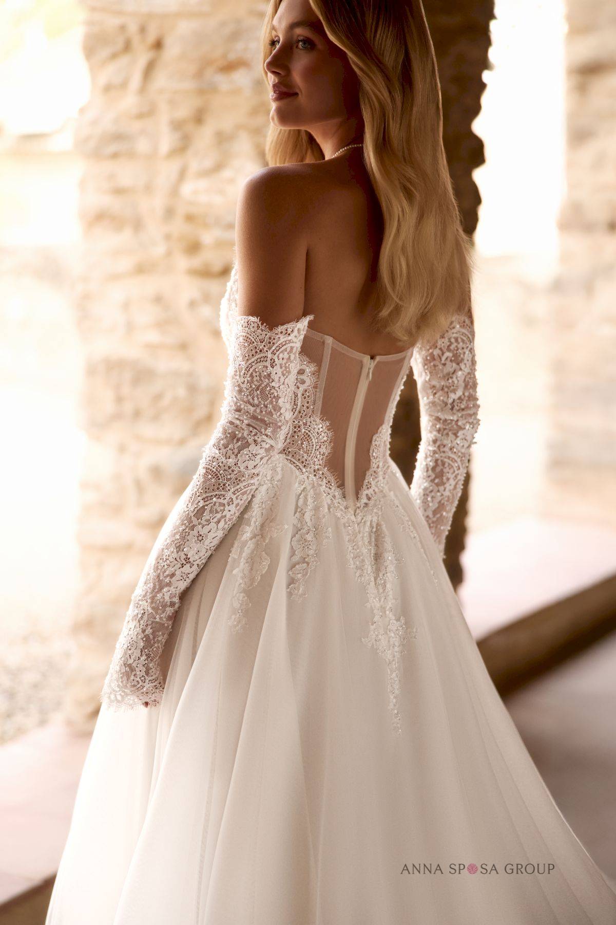 Le haut de la robe est sublime : il met en valeur votre port de tête avec des épaules dénudées, apportant beaucoup de délicatesse à votre silhouette. Le corset est un vrai travail d'orfèvre, brodé d'une dentelle originale et délicatement orné de perles et de sequins pour briller discrètement sous la lumière.