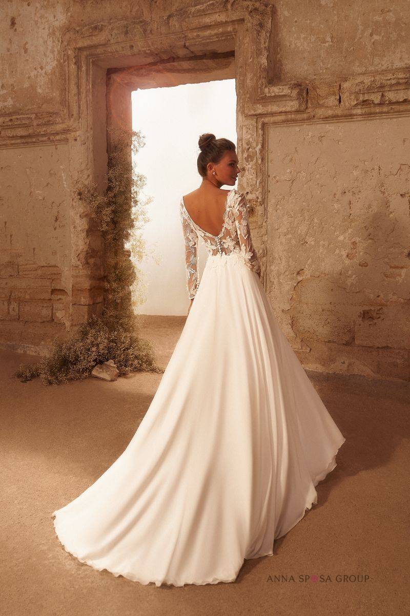 Dites Oui à la légèreté, la fluidité et l'élégance dans cette jolie robe de mariée manches longues bohème parsemé de brillant discret pour vous sublimer le jour J,
