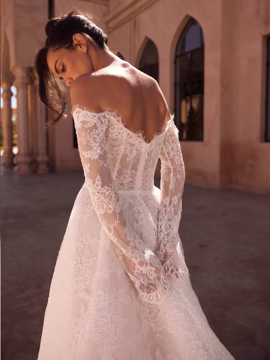 Son fini "full dentelle" sur toute la silhouette qui offre un aspect couture incomparable. Vous pouvez la porter pour une cérémonie grandiose pour un côté très "altesse" ou pour un mariage romantique et sophistiqué : c'est vous qui choisissez votre style !